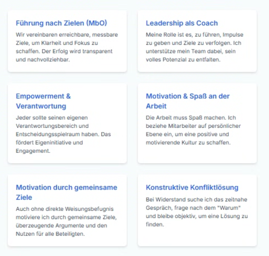 Meine Führung basiert auf klaren Prinzipien, die auf Empowerment, Motivation und messbaren Zielen beruhen. Diese Leitlinien prägen meinen Umgang mit Teams und die Art und Weise, wie ich gemeinsame Erfolge erziele.