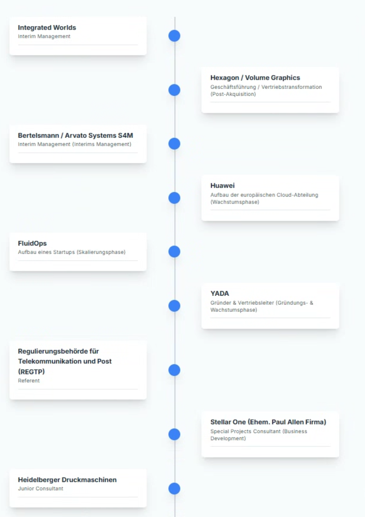 Ein interaktiver Überblick über meine wichtigsten beruflichen Stationen. Klicken Sie auf die einzelnen Titel, um mehr über meine Verantwortlichkeiten, Herausforderungen und Erfolge zu erfahren.